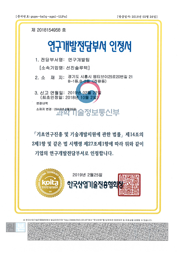 연구개발전담부서 인정서